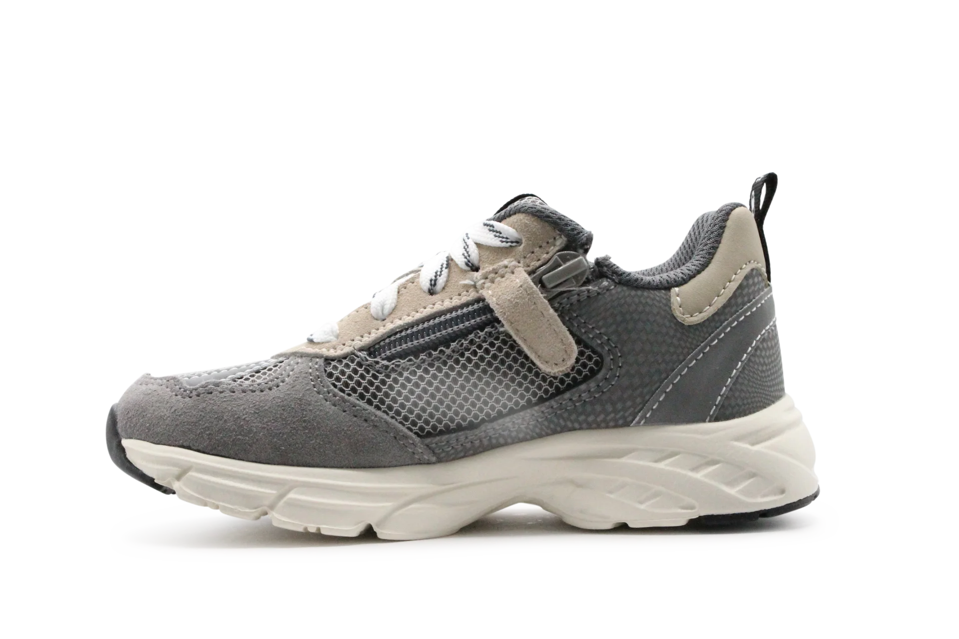 De veter- én ritssluiting maken het aantrekken supereenvoudig, en dankzij de lichtgewicht zool loopt je kind soepel en stabiel. De schoen sluit goed aan, wat ‘m ook geschikt maakt voor smallere voetjes. Daan Dash Grijs is de ideale keuze voor actieve kids met stijl.