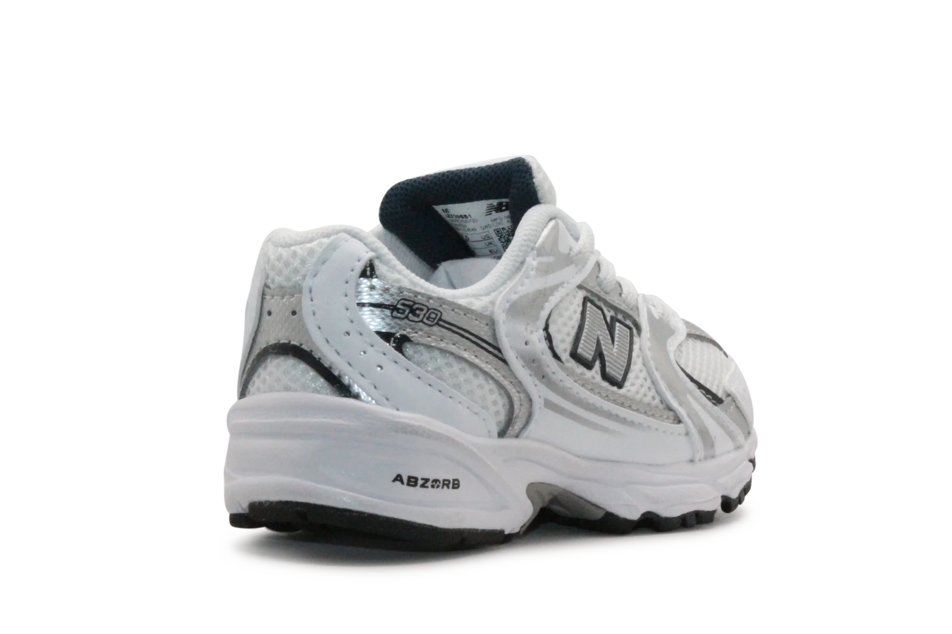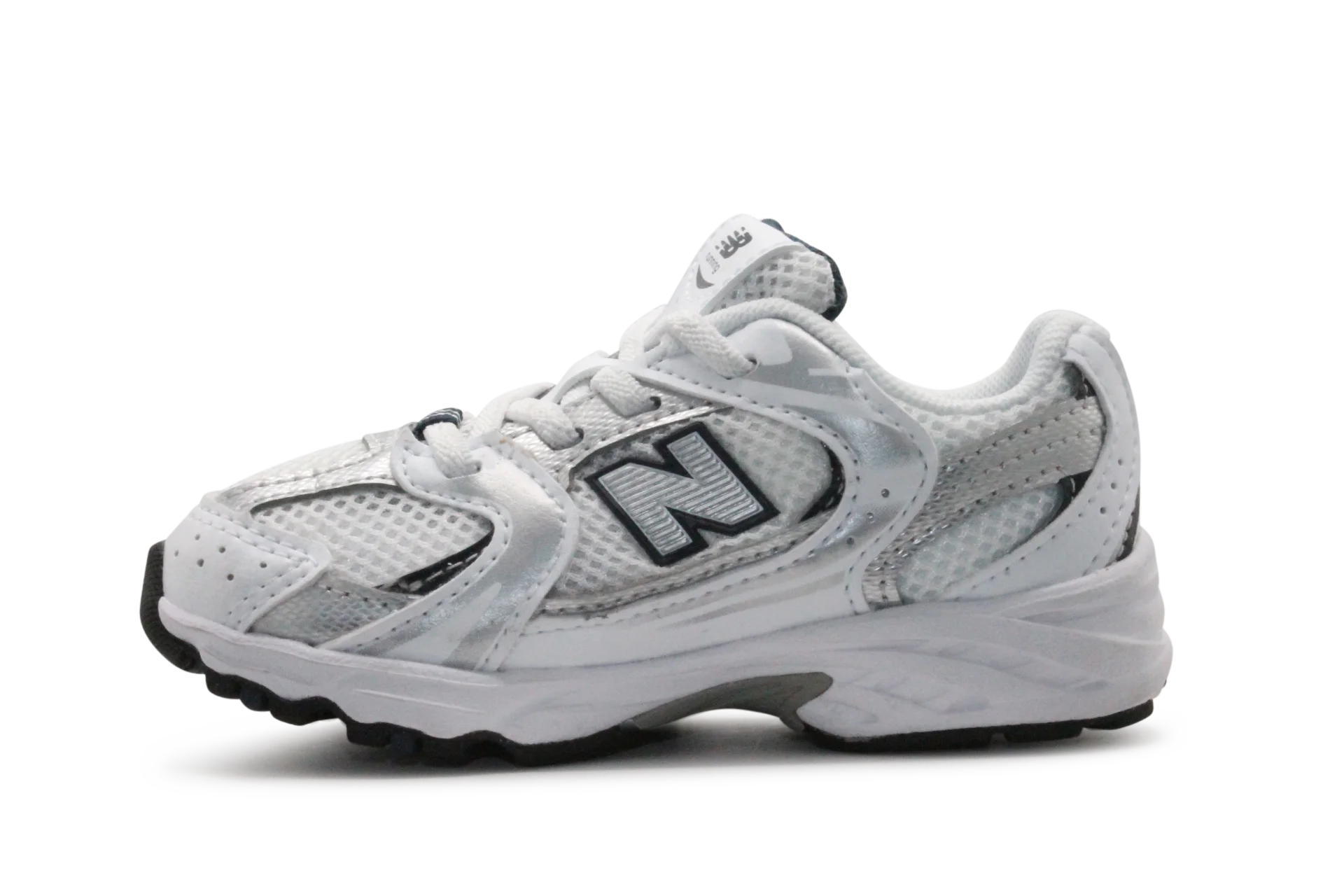De New Balance 530 White is een frisse en sportieve sneaker voor kids die houden van beweging én stijl. Met een bovenwerk van ademend mesh, wit kunstleer en zilverkleurige accenten heeft deze schoen een coole, futuristische look. Het iconische ‘N’-logo in zwart-wit contrasteert mooi tegen de metallic glans van het bovenwerk. Een echte blikvanger op het schoolplein of tijdens een actieve dag buiten!